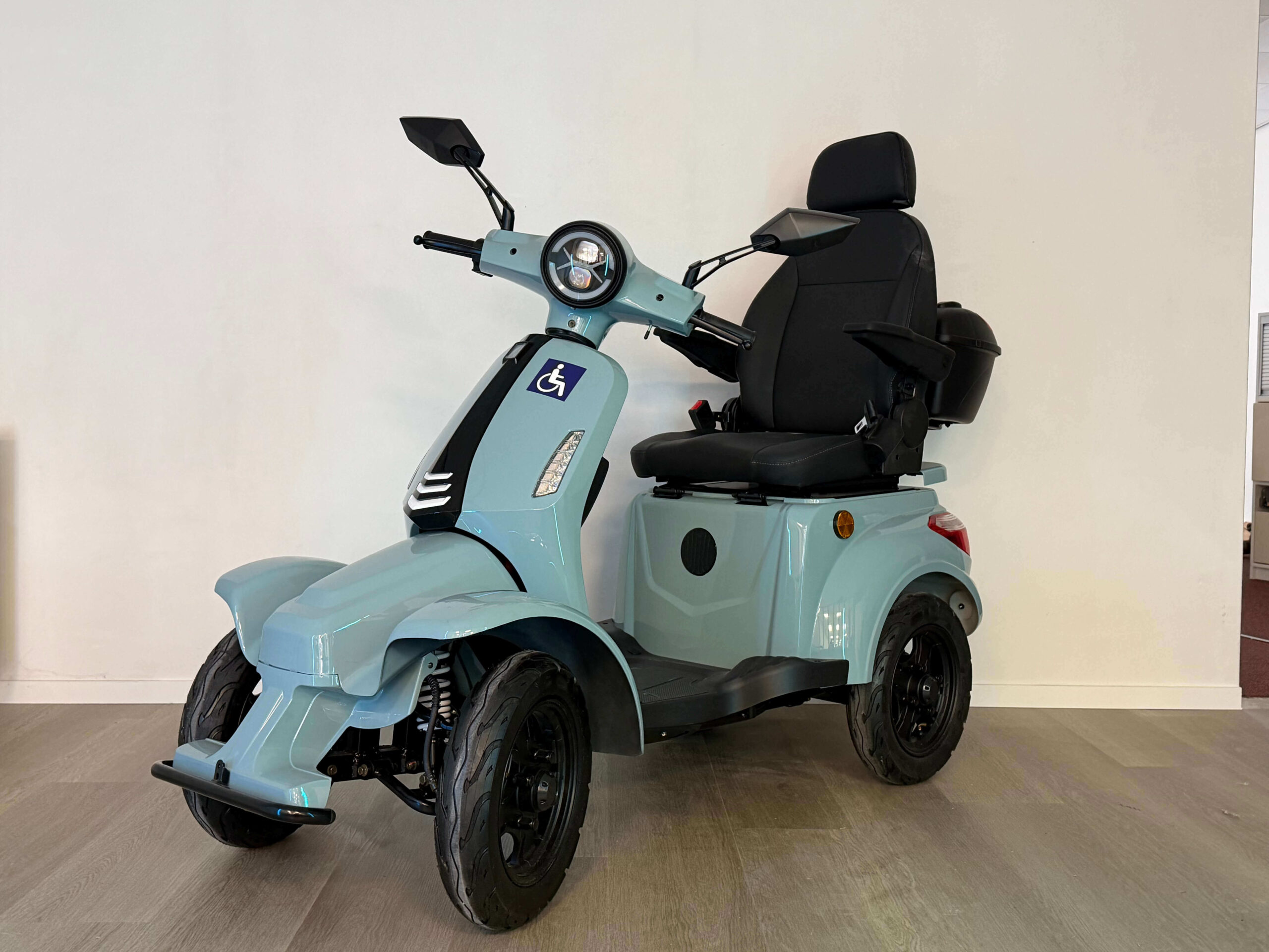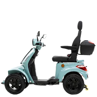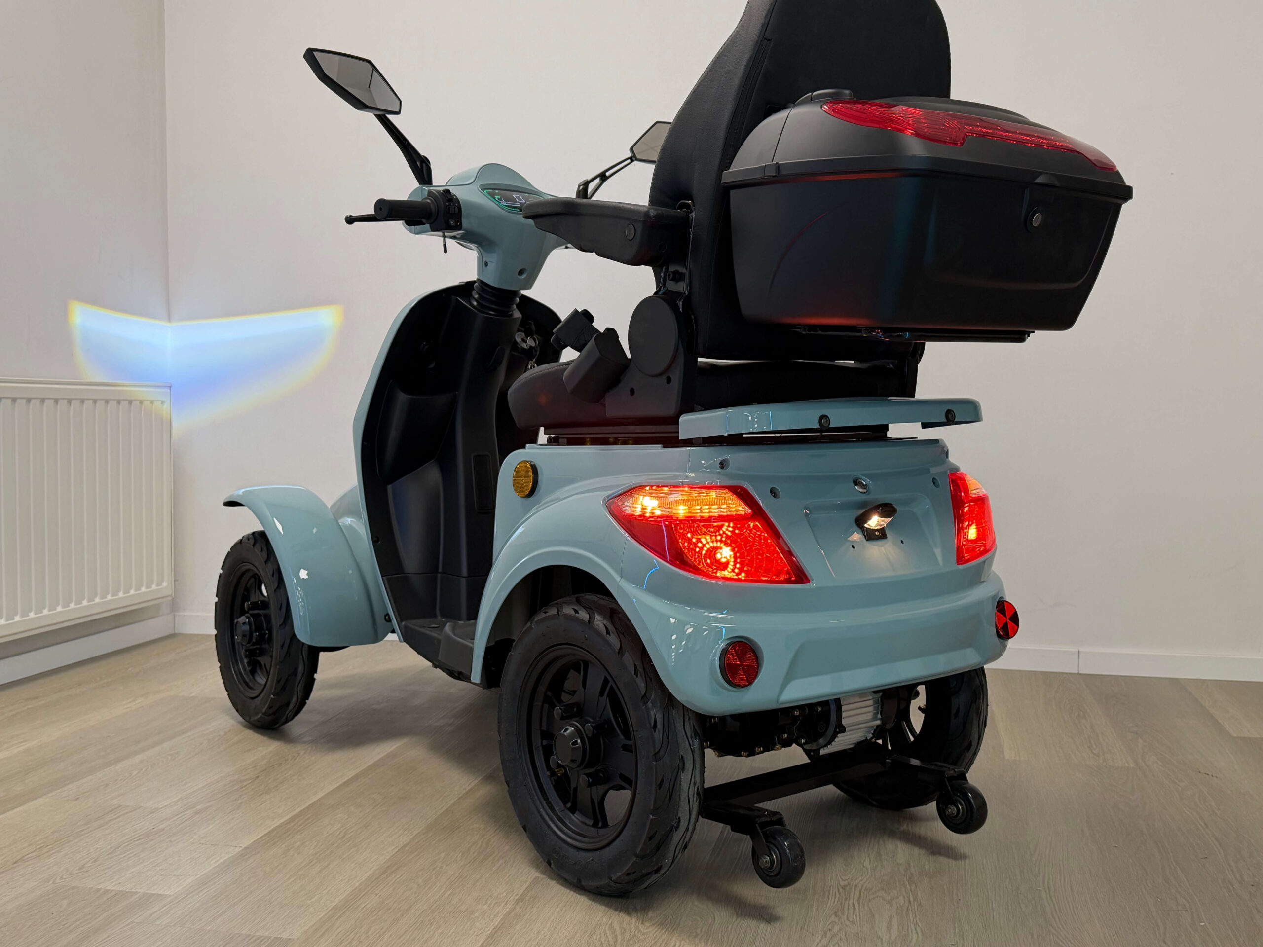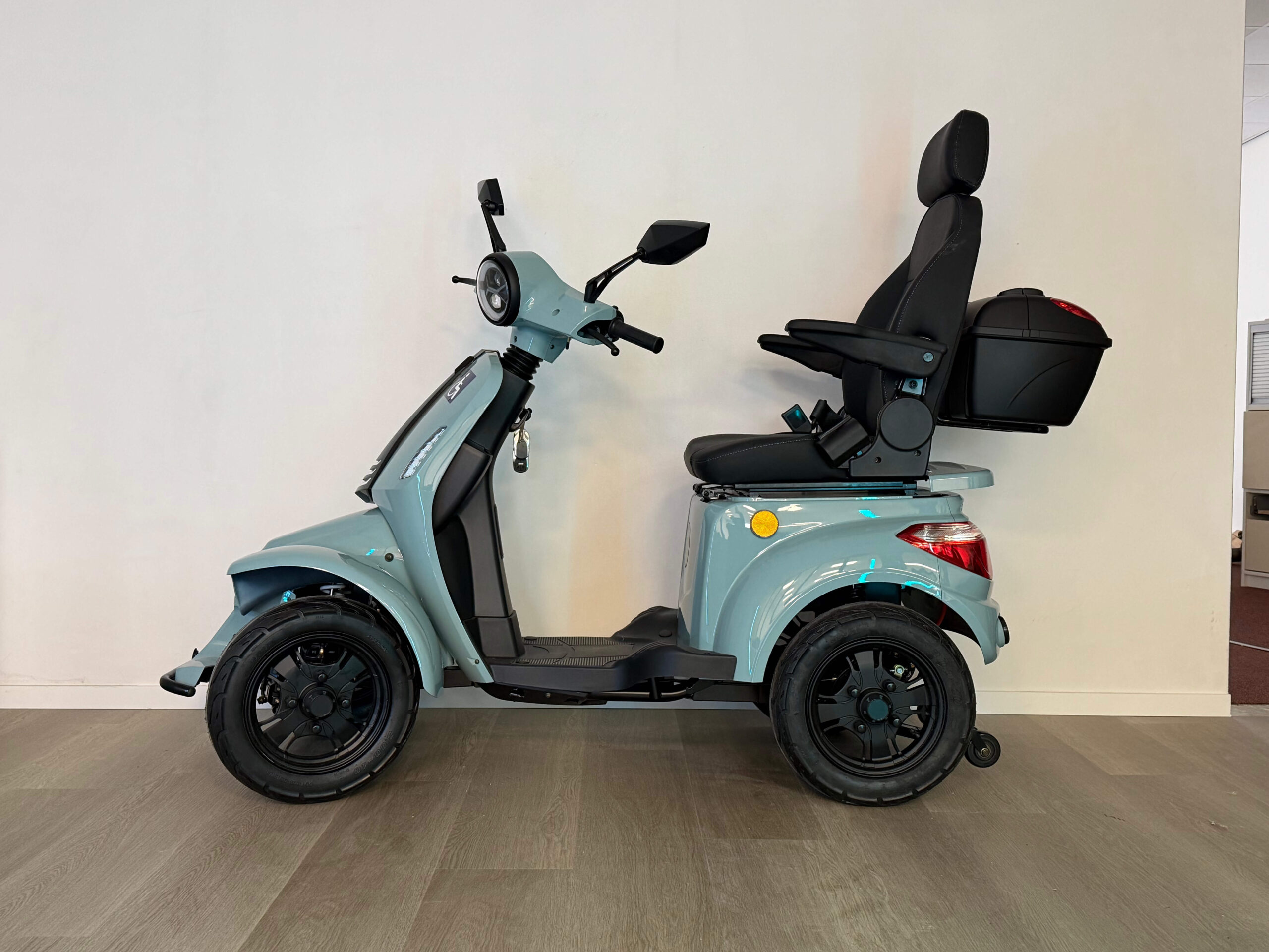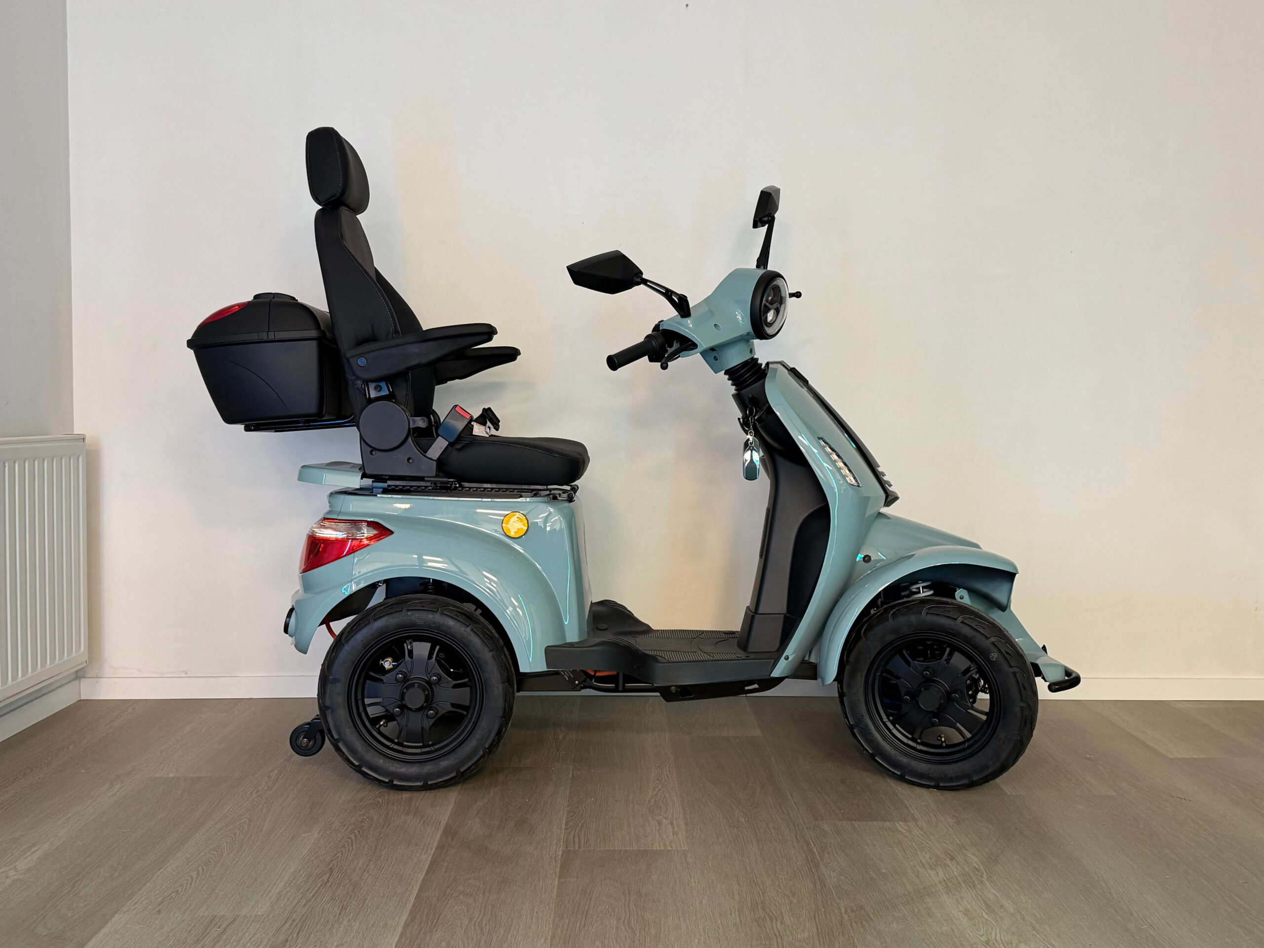 De On Four is gebouwd voor vertrouwen. Vanaf de eerste meters voelt u dat deze scootmobiel stevig en stabiel op de weg ligt. Oneffenheden worden goed opgevangen en ook bij hogere snelheden blijft het rijgedrag voorspelbaar en comfortabel. Dit maakt hem geschikt voor zowel beginnende als ervaren gebruikers die zekerheid willen tijdens het rijden.