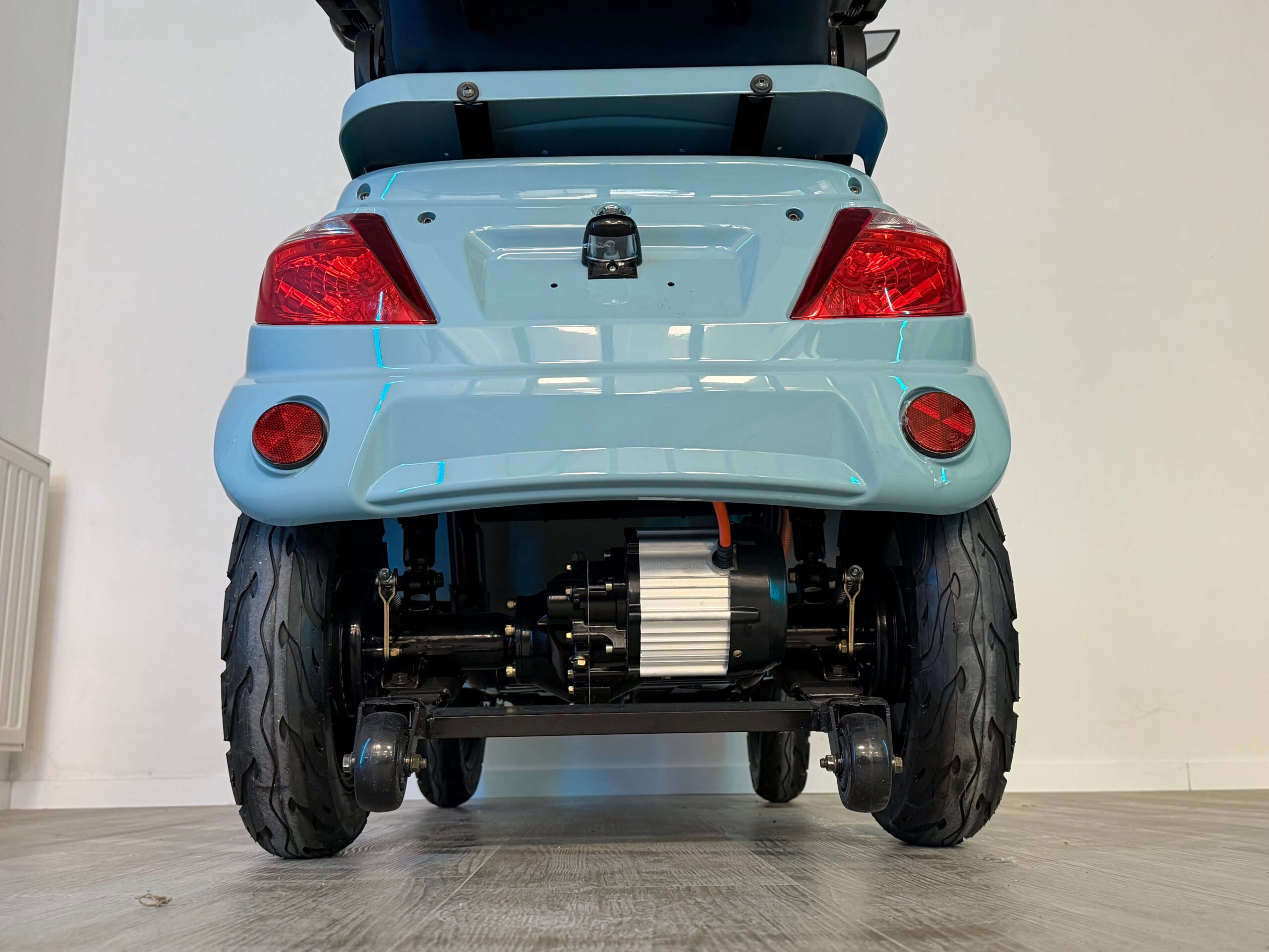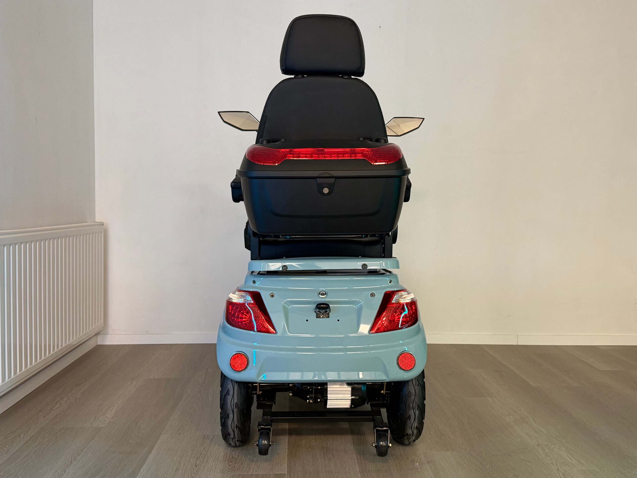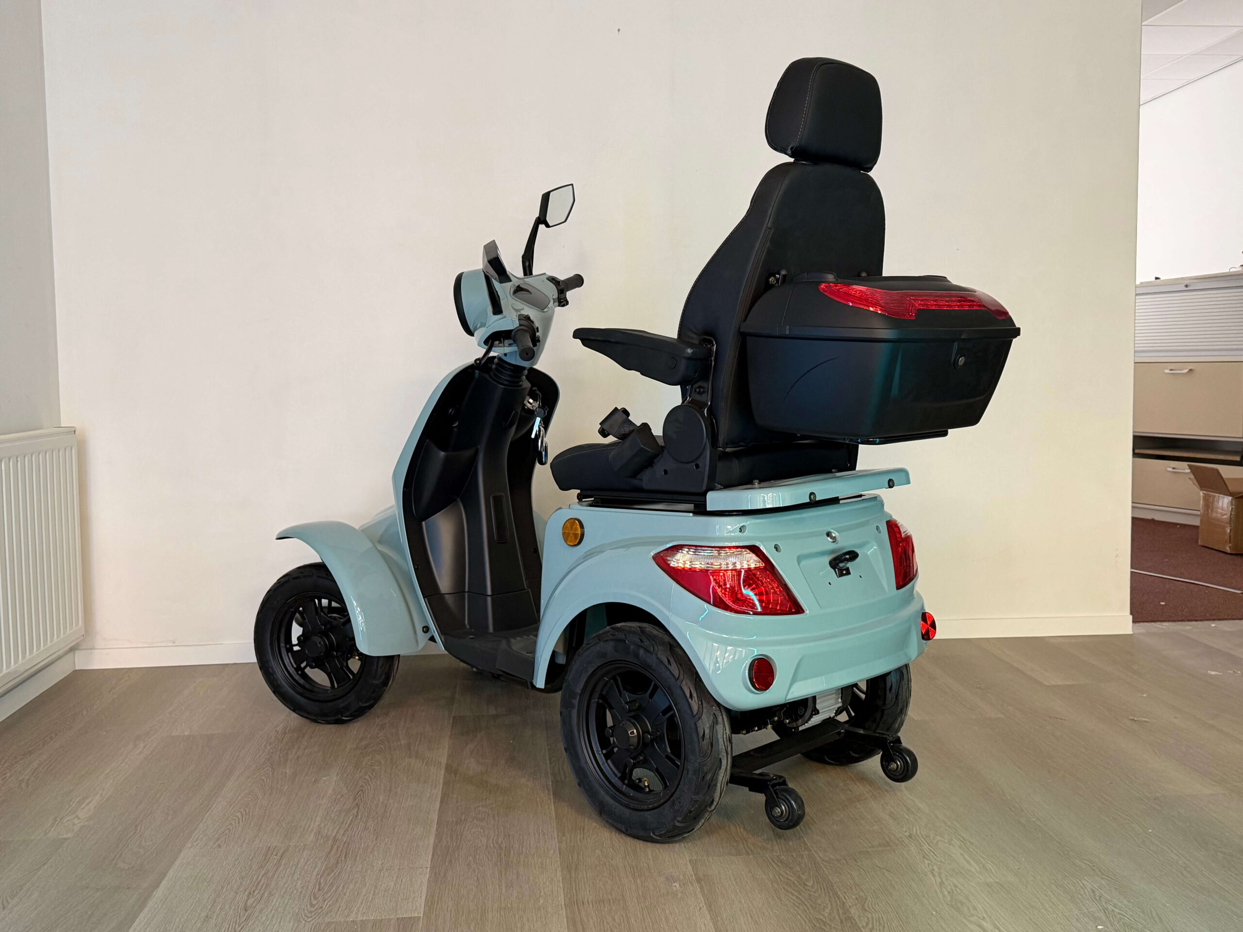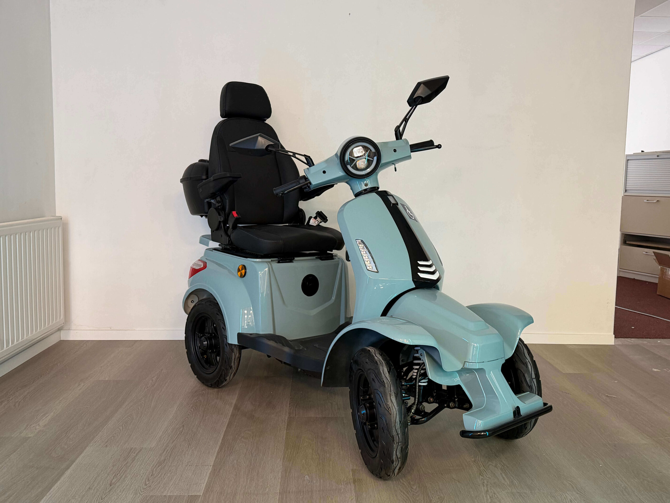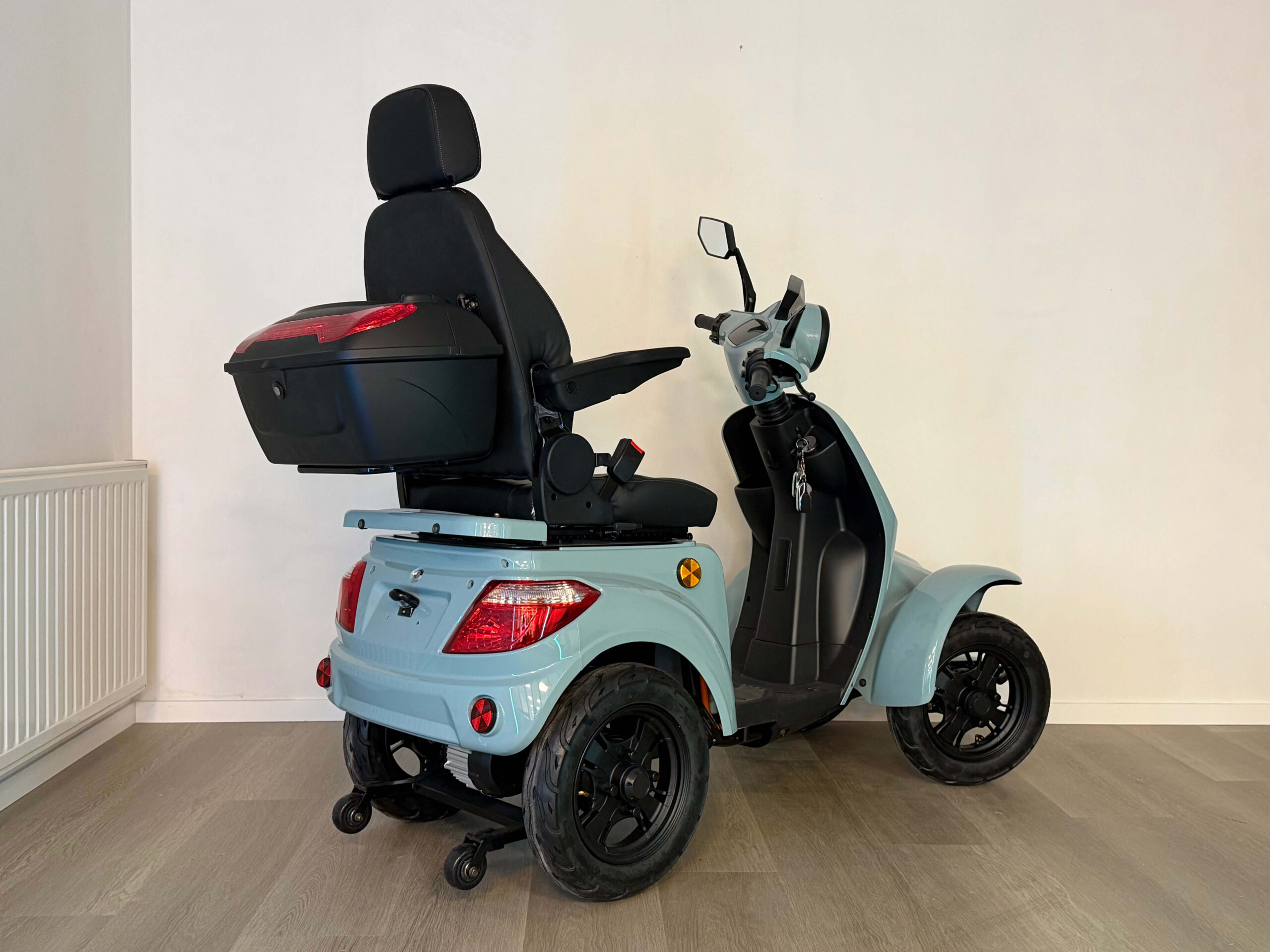 De On Four is gebouwd voor vertrouwen. Vanaf de eerste meters voelt u dat deze scootmobiel stevig en stabiel op de weg ligt. Oneffenheden worden goed opgevangen en ook bij hogere snelheden blijft het rijgedrag voorspelbaar en comfortabel. Dit maakt hem geschikt voor zowel beginnende als ervaren gebruikers die zekerheid willen tijdens het rijden.
